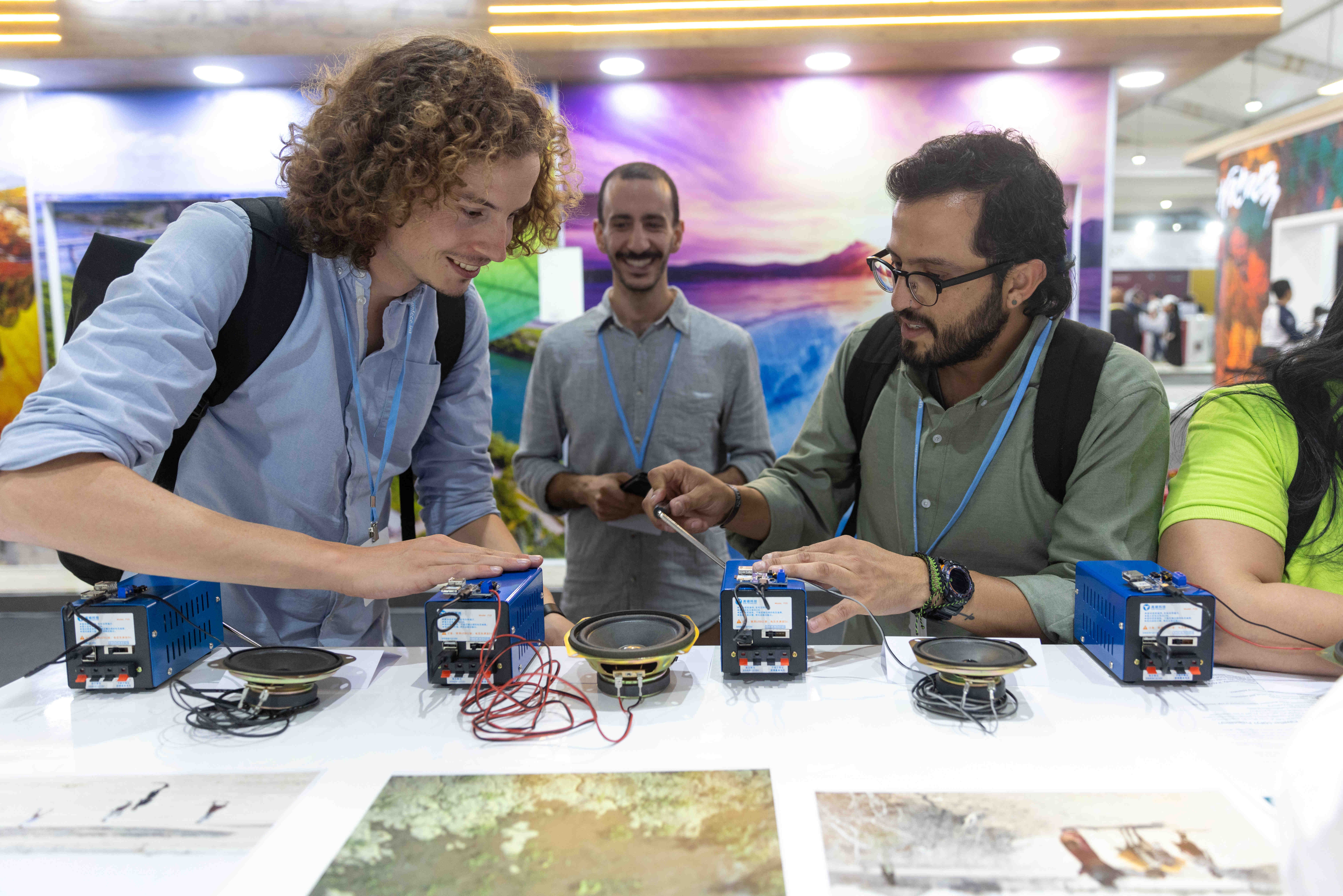 Jorrit Kiewik, Alan Ahued ve Raúl Mondragón Segura, COP27'deki IFAD pavyonunda kırsal kesimdeki gençlerin iklim değişikliğine yönelik çözümlerini içeren bir ses yerleştirmesini deniyor. © IFAD/Roger Anis
