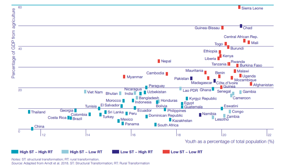 Tarımsal olarak bağımlı ülkelerdeki pek çok gencin, ya çiftlikte ya da tarımla ilgili hizmet ve işleme sektörlerinde tarıma dayalı geçim kaynakları oluşturması gerekecektir. Gençler tarihsel olarak çok sayıda tarımdan çıkmış olsalar da, imalat ve hizmetlerde iş yaratmanın, işgücüne yeni giren milyonlarca kişiyi özümsemek için yeterli olması muhtemel değildir. Pek çok genç, özellikle Sahra'nın güneyindeki Afrika'da, önümüzdeki yıllarda çiftliklerde veya kırsal alanlarda kalacak.