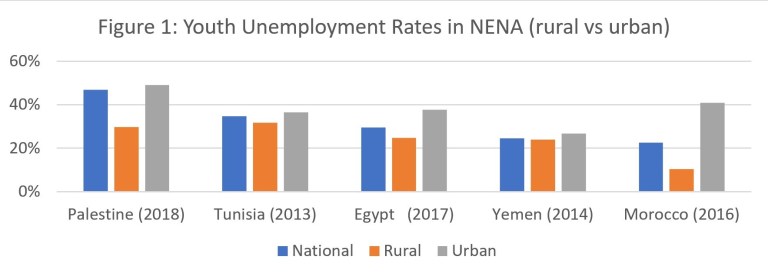 Mevcut verilere sahip NENA ülkelerinde, kentsel alanlarda genç işsizlik oranları daha yüksektir. Örneğin Fas'ta, kentsel alanlardaki genç işsizlik oranları, kırsal alanlara göre dört kat daha yüksektir (Şekil 1). RDR, bu olguyu kırsal dönüşüm süreci bağlamında açıklamaktadır. Tarım dışı ekonomideki yapısal dönüşümler sekteye uğradığında, gençlerin işgücüne daha kolay dahil olabilecekleri bir sektör olan tarımdan imalat ve hizmetler gibi diğer sektörlere geçişlerini engelliyor. Sonuç, kırsal alanlarda daha yüksek eksik istihdam oranları ve kentsel alanlarda daha yüksek işsizlik oranlarıdır.